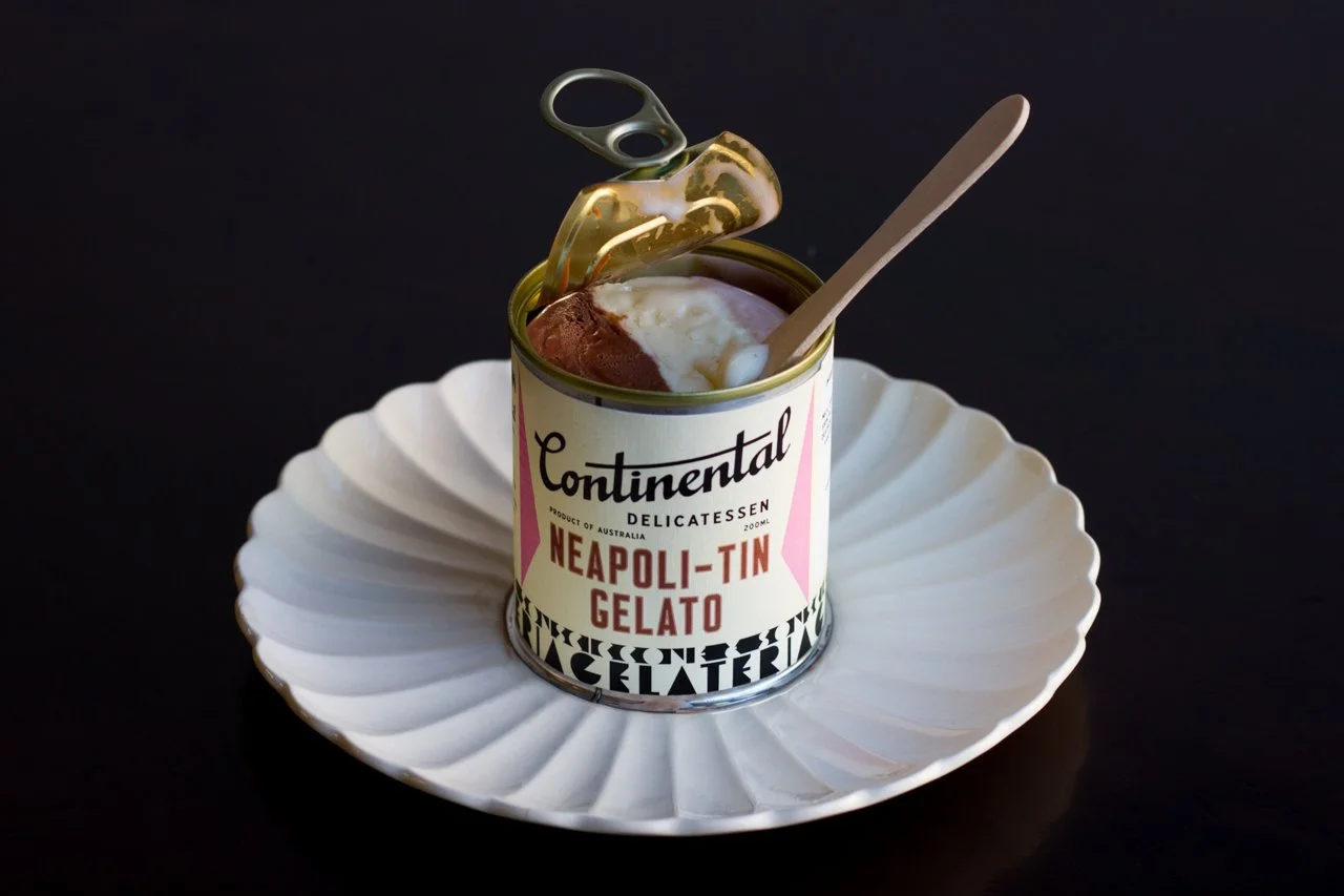 Bespoke GelatoContinental Delicatessen, Newtown The Neapoli-Tin was originally conceived as a version of the classic Aussie Neapolitan ice-cream comprising three separate flavours of gelato custom moulded, cut and tinned.